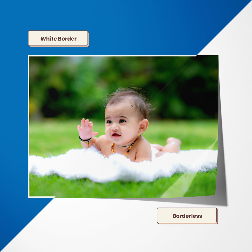 Prints are borderless, covering the entire area. If you need a white border/padding inside, please mention it in the selection as Yes. In that case, Your print size is inclusive of the border area as well.
